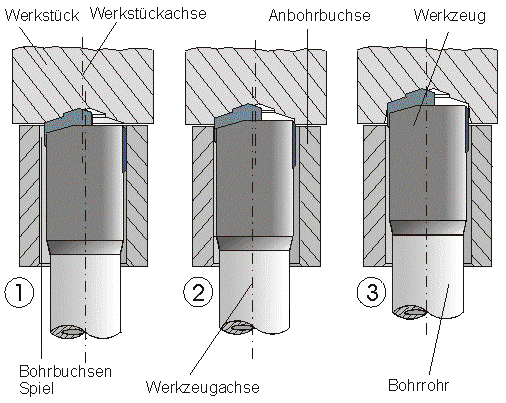 Tiefbohrwerkzeuge müssen beim Anbohren in einer Anbohrbuchse geführt werden, weil sich die Bohrkräfte nicht, wie z.B. beim Wendelbohrer mit zwei Schneiden, gegenseitig aufheben. Daher muss das Werkzeug während des Bohrvorgangs abgestützt (geführt) werden.