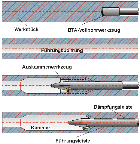 Als Beispiel einer Auskammerbearbeitung mit einem in der Vorbohrung geführten Werkzeug ist die Kurzkammertechnologie zum Auskammern gezeigt.