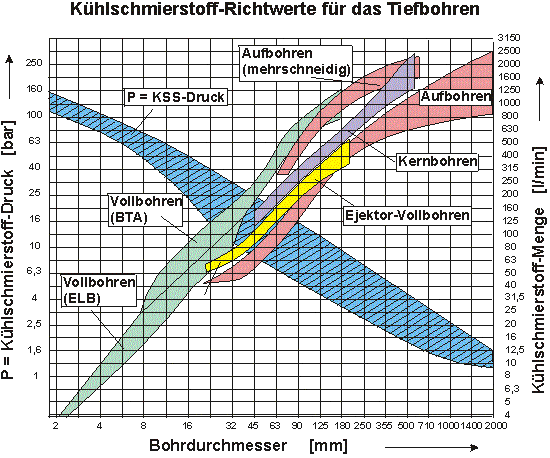 Begrenzt durch die Schnittpunkte mit der blauen Zone finden Sie links den Bereich für den empfohlenen KSS-Druck