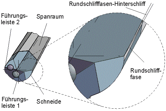 Wendelbohrers. Die Führungsleisten und die Rundschlifffase eines Tiefbohrwerkzeugs bilden die 3 den Werkzeug-Nenndurchmesser bestimmenden Zonen. Der Radius der Rundschlifffase im gelöteten Werkzeug
