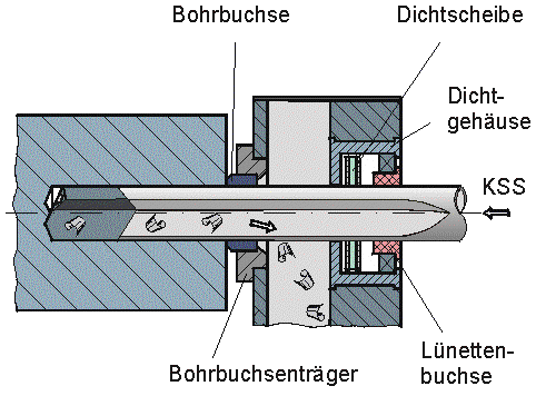 der Regel nach unten abgeleitet. Um ein Austreten des KSS hinter dem Spänekasten auszuschließen, trägt er eine Dichtscheibe, die entsprechend dem Schaftquerschnitt des ELB-Tiefbohrwerkzeugs ausgenommen ist. Im Spänekasten kann daneben auch noch ein zusätzliches Bohrrohrstützlager (Lünette) angeordnet sein.